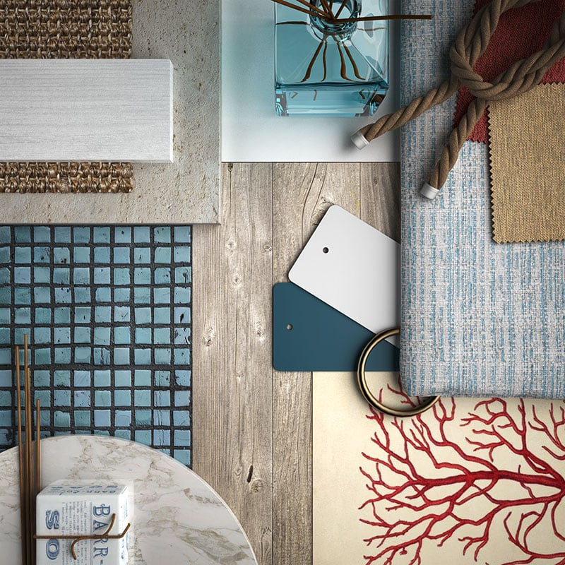 Ci-dessus, vous pouvez voir les matériaux moodboard que j’ai créés dans la modélisation 3D en combinant bois brut avec une mosaïque bleue, pierre avec bois blanc, surfaces laquées mates et un tissu à motif rayé irrégulier juxtaposé avec des découpes rouges et beiges. Pour terminer, j’ai ajouté des objets à saveur coloniale et une estampe représentant un corail.